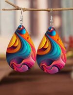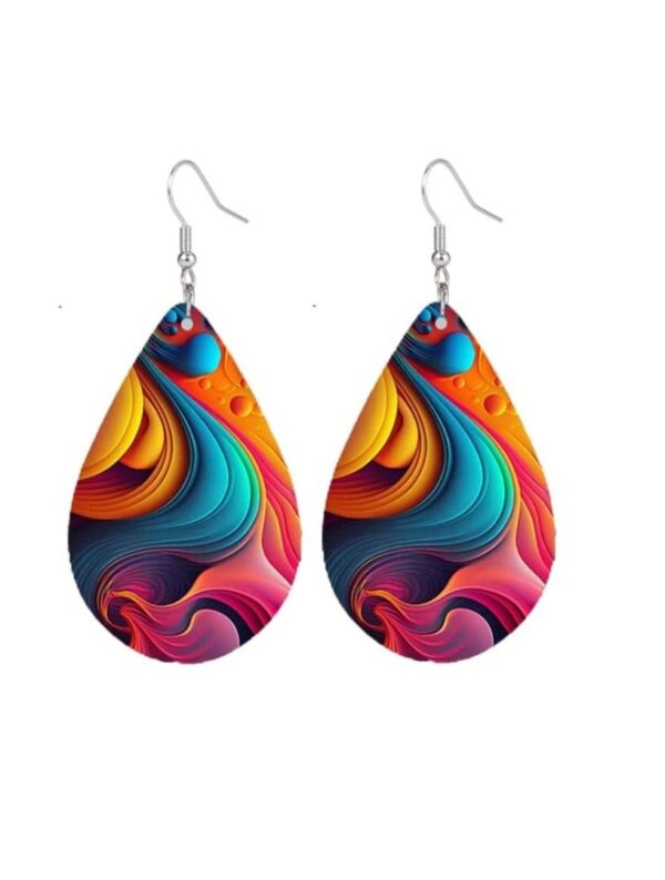Print Water Drop Wooden Hook Earrings.